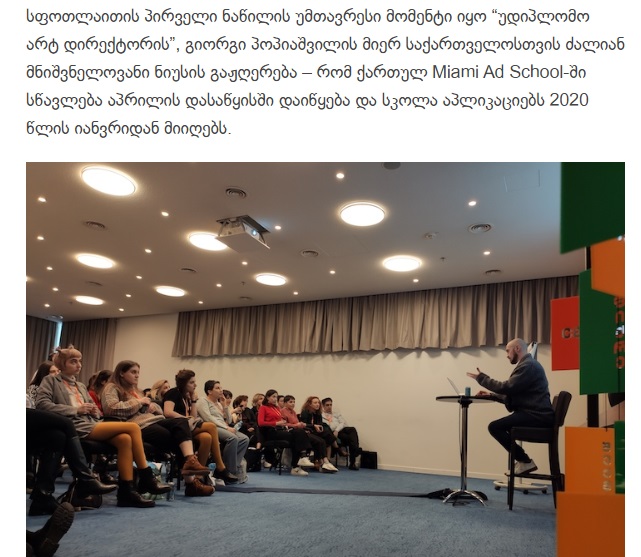 პირველად სწორედ აქ გაჟღერდა 2019 წლის მართლაც ერთ-ერთი უმნიშვნელოვანესი ამბავი – საქართველოში Miami AD School იხსნება. განაცხადების მიღება 2020 წლის იანვარში დაიწყება, სასწავლო პროცესი კი – გაზაფხულზე. სხვა დეტალები, როგორც გიორგი პოპიაშვილმა გვითხრა, უახლოეს მომავალში გახდება ცნობილი.