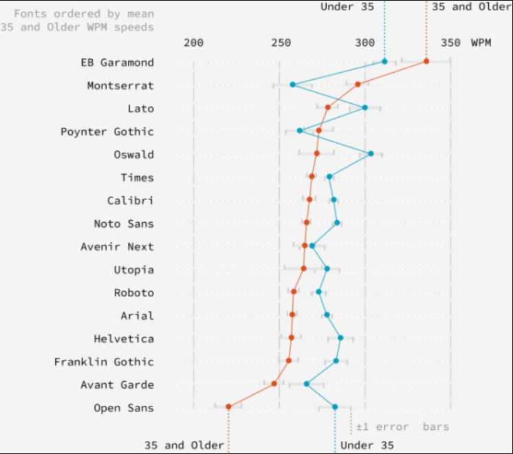 ამასთან, ერთი დასკვნა ნათელი იყო: 35 წელზე დიდი ასაკის მონაწილეები ყველა შრიფტით, საშუალოდ, უფრო ნელა კითხულობდნენ ახალგაზრდა მონაწილეებთან შედარებით. გამონაკლისს მხოლოდ EB Garamond და Montserrat წარმოადგენდა. ამის მიზეზად კი ის დასახელდა, რომ Monsterrat-ში ყველაზე მაღალი x-ია გამოყენებული. წარსულში კი ტიპოგრაფები შრიფტებში მაღალი ზომის x-ს იყენებდნენ, რათა წაკითხვა უფრო ადვილი ყოფილიყო.