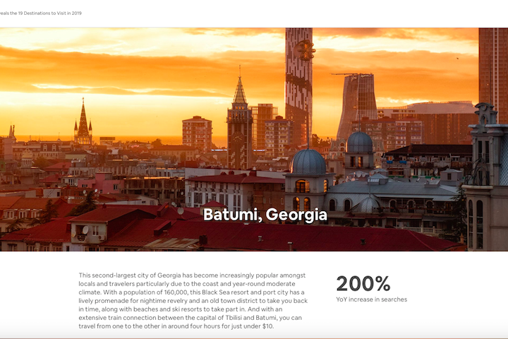 აჭარის ტურიზმისა და კურორტების დეპარტამენტის ცნობით, ბათუმი Airbnb-ის 2019 წლის, ყველაზე მოთხოვნად სამოგზაურო მიმართულებებს შორის დასახელდა. საიტის საძიებო სისტემისა და ჯავშნების მზარდ მონაცემებზე დაყრდნობით, ბათუმი ესპანეთის, ბრაზილიის, იტალიის, შოტლანდიისა და სხვა ქვეყნების ქალაქების ჩამონათვალს შორისაა. სტატიაში ნათქვამია, რომ შავი ზღვის კურორტი, სულ უფრო და უფრო პოპულარული ხდება ადგილობრივ და საერთაშორისო მოგზაურებს შორის.