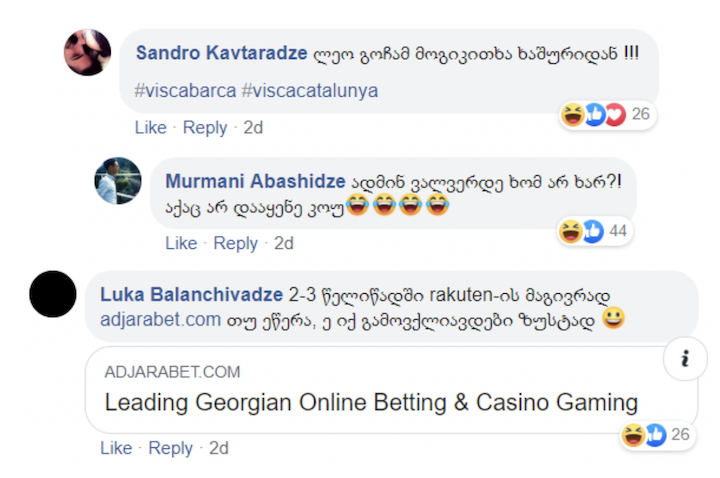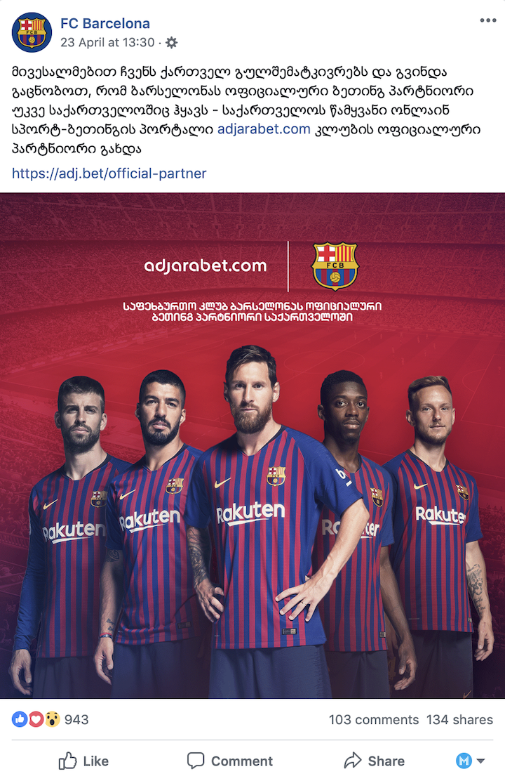 კატალონიის ბარსელონას ოფიციალურმა ფეისბუქ გვერდმა, 23 აპრილს, ყველასთვის მოულოდნელად, პოსტი ქართულ ენაზე გამოაქვეყნა და გულშემატკივრებს აცნობა, რომ კლუბს საქართველოში უკვე ოფიციალური პარტნიორი ჰყავს.