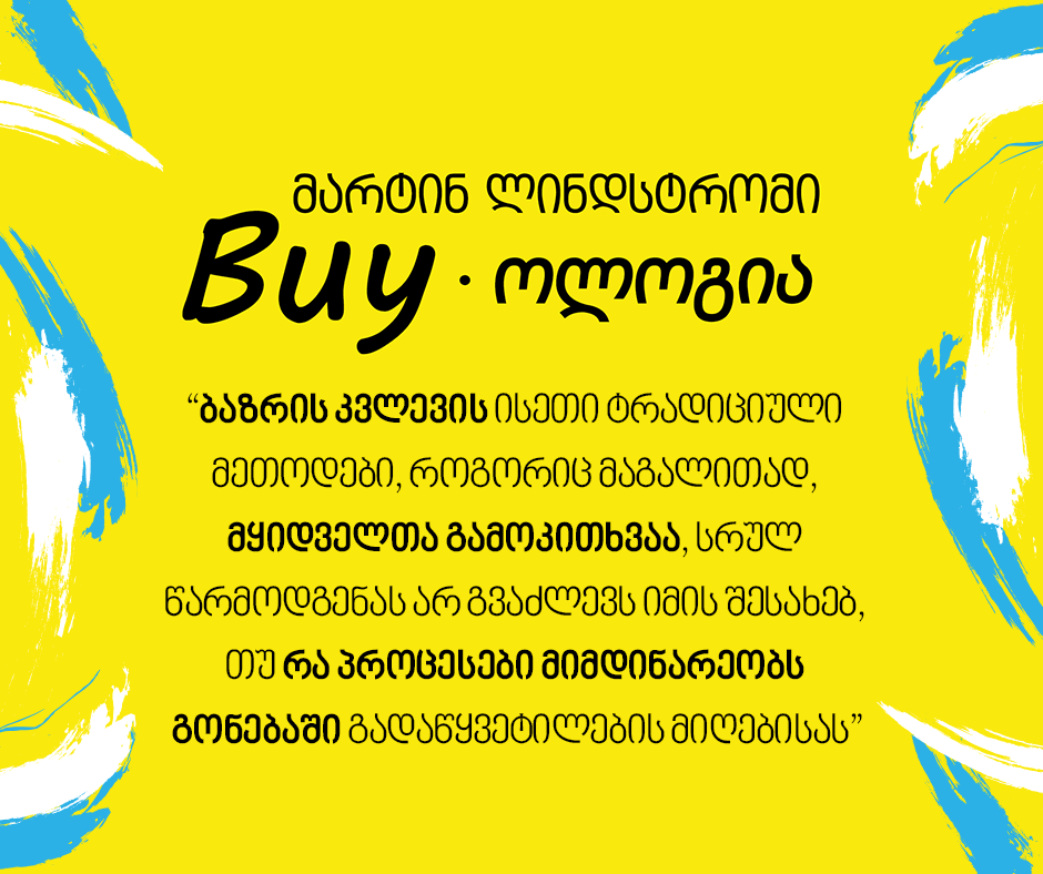 „ვიცით, რატომ ვყიდულობთ ამა თუ იმ ნივთს? რა ზემოქმედებს სინამდვილეში ჩვენს გადაწყვეტილებებზე? თვალში საცემი რეკლამები, მყვირალა სლოგანები თუ გადამდები მელოდიები და ტექსტები? თუ ყიდვის შესახებ გადაწყვეტილებებს ქვეცნობიერად, ანუ ისე ვიღებთ, რომ ამას ვერც კი ვიაზრებთ? ამ საკითხებზე მარტინ ლინდსტრომი გვესაუბრება წიგნში „Buyოლოგია“. აღსანიშნავია, რომ გაყიდვების სახელმძღვანელო, გამოსვლიდან ძალიან მალე, New York Times-ისა და Wall Street Journal–ის ბესტსელერი გახდა“.