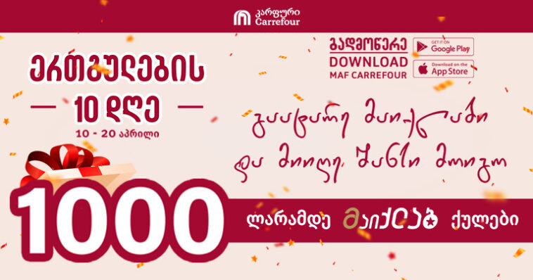 აღნიშნე კარფურის 10 წლის იუბილე, შეუერთდი ერთგულების 10 დღიან კამპანიას და არ გამოტოვო შანსი მოიგო 1000 ლარამდე მაიქლაბ ქულები ახალი აპლიკაციის გამოყენებით.