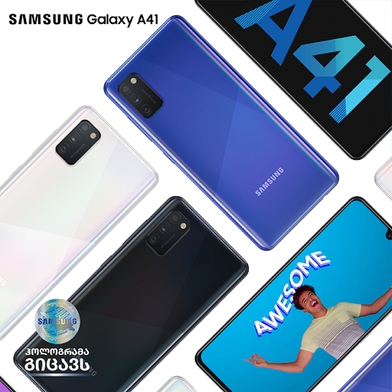 სერიის ერთ-ერთი თვალსაჩინო წარმომადგენელი Galaxy A41-ია. ის წარმოდგენილია 6.1’’-იანი Super AMOLED (რეზოლუცია:1080×2400) უსაზღვრო U-ტიპის ეკრანით, ხოლო პიქსელების სიმჭიდროვე 431 ppi-ია. ეკრანს შესანიშნავი დეტალიზაციით და Samsung-ისთვის დამახასიათებელი მკვეთრი ფერებით შეუძლია, თქვენთვის სასურველი ფილმის ან ვიდეოს გამოსახულების გადმოცემა. ეკრანი Corning Gorilla Glass 3-ით არის დაცული. მიუხედავად მისი ზომისა, ის იდეალურად ერგება ხელს და კომფორტული გამოსაყენებელია. Galaxy A41-ში წარმოდგენილია 3 მთავარი კამერა: პირველ კამერას აქვს 48 MP-იანი სენსორი, რომელიც კარგი განათების პირობებში შესანიშნავ ფერებს, დეტალიზაციას და კარგ დინამიკურ დიაპაზონს გვაძლევს. მეორე კამერას აქვს 5 MP-იანი სიღრმის სენსორი, რომელიც ეხმარება მთავარ 48MP-იან კამერას ცოცხალი ფოკუსით პორტრეტების გადაღებაში, ხოლო მე-3 კამერა უკვე ულტრა განიერი ლინზით (8 MP) იღებს, რაც იდეალურია შენობების, პეიზაჟების ან ჯგუფური ფოტოების გადასაღებად. სმარტფონი შესანიშნავად არის ოპტიმიზირებული და ინტერფეისში ხარვეზებს ვერ შეხვდებით. Galaxy A41-ს აქვს 4 GB-იანი ოპერატიული და 64 GB შიდა მეხსიერება, რომლის გაზრდაც 512 GB-მდე მიკრო ბარათით არის შესაძლებელი. წინა მოდელთან შედარებით, გაუმჯობესებულია ბატარეა, რომელიც 3500 mAh-ს შეადგენს და 1 დღეს საშუალო მოხმარების შემთხვევაში თავისუფლად გაძლებს, აღსანიშნავია, რომ მისი დამუხტვისას ის სისწრაფე 0-იდან 60%-ამდე მხოლოდ 30 წუთს შეადგენს.