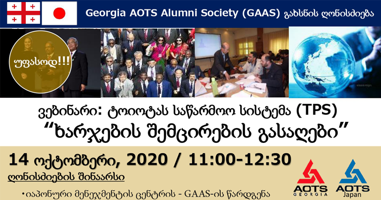 „იაპონური მენეჯმენტის ცენტრი – GAAS გახსნის ცერემონიალი და იაპონელ ექსპერტთა ვებინარი: ხარჯების შემცირების გასაღები შედგება, ელექტრონულად, 14 ოქტომბერს, 11:00-12:30 საათზე, „ონლაინ“ პლატფორმა ZOOM-ის საშუალებით. იხილეთ ღონისძიებაზე რეგისტრაციის ბმული“.