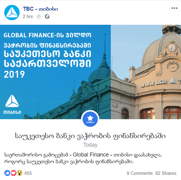 Global Finance-მა, „თიბისი“, ვაჭრობის ფინანსირებაში, 2019 წლის საუკეთესო ბანკად დაასახელა. საერთაშორისო გამოცემამ, ფინანსურ ინსტიტუტებს შორის გამარჯვებული, უკვე მეცხრამეტედ გამოავლინა და წელს, მათ შორის, TBC მოხვდა. იმავე კატეგორიაში, კიდევ 112 ქვეყნის ადგილობრივი ბანკები დააჯილდოეს. ამ სიახლეს გამოეხმაურა თავად „თიბისი“.