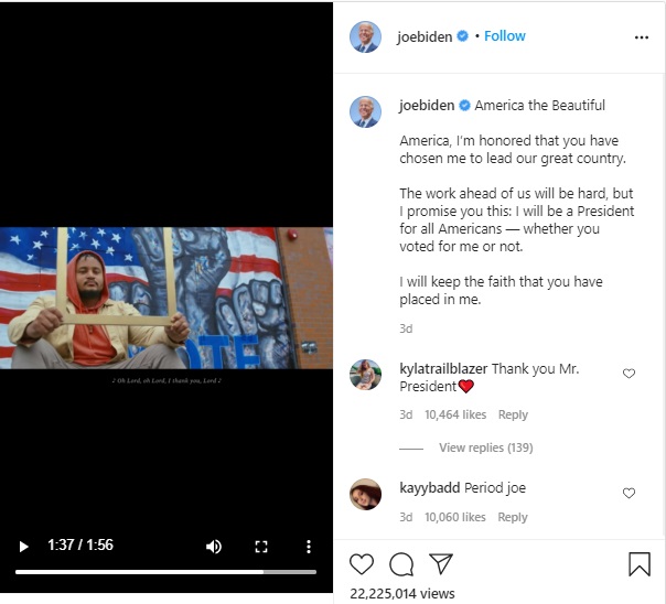 ამერიკის შეერთებული შტატების 46-ე პრეზიდენტი ჯო ბაიდენი გახდა. არჩევნები რომ დასრულდა, მან, გამარჯვებას, საკმაოდ სენტიმენტალური ვიდეორგოლი მიუძღვნა და ამერიკელებს მადლობა ამ სიტყვებით გადაუხადა: „ჩემთვის დიდი პატივია, რომ ჩვენი ქვეყნის მეთაურად ამირჩიეთ. . . გპირდებით, ვიქნები ყველა ამერიკელის პრეზიდენტი, მნიშვნელობა არ აქვს, მე მომეცით თუ არა ხმა. თქვენ რომ გამიჩინეთ, იმ რწმენას ბოლომდე შევინარჩუნებ“.