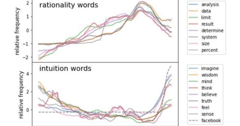 მილიონობით წიგნის ენის ანალიზით, მკვლევრებმა დაადგინეს, რომ სიტყვები, რომლებიც დაკავშირებულია მსჯელობასთან — “დეტერმინაცია” (განსაზღვრა) და “დასკვნა”, სისტემატურად იზრდებოდა 1850 წლიდან. მეორე მხრივ, მცირდებოდა ისეთი სიტყვების მნიშვნელობა, როგორიცაა “გრძნობა” და “რწმენა”. თუმცა ბოლო 40 წლის განმავლობაში ეს ტენდენცია საგრძნობლად შეიცვალა, ფაქტობრივად, საპირისპირო მხარეს შემობრუნდა — ასე გადაულოცა უპირატესობა რაციონალურმა მიდგომებმა გრძნობისმიერს. გარდა ამისა, წიგნის ენაში მხოლობითი და მრავლობითი ნაცვალსახელების თანაფარდობის მნიშვნელოვანი ცვლილებით, როგორიცაა “მე”/”ჩვენ” ნათლად ჩანს, რომ ადამიანების ფოკუსი კოლექტივისტურიდან ინდივიდუალისტურზე გადაერთო.