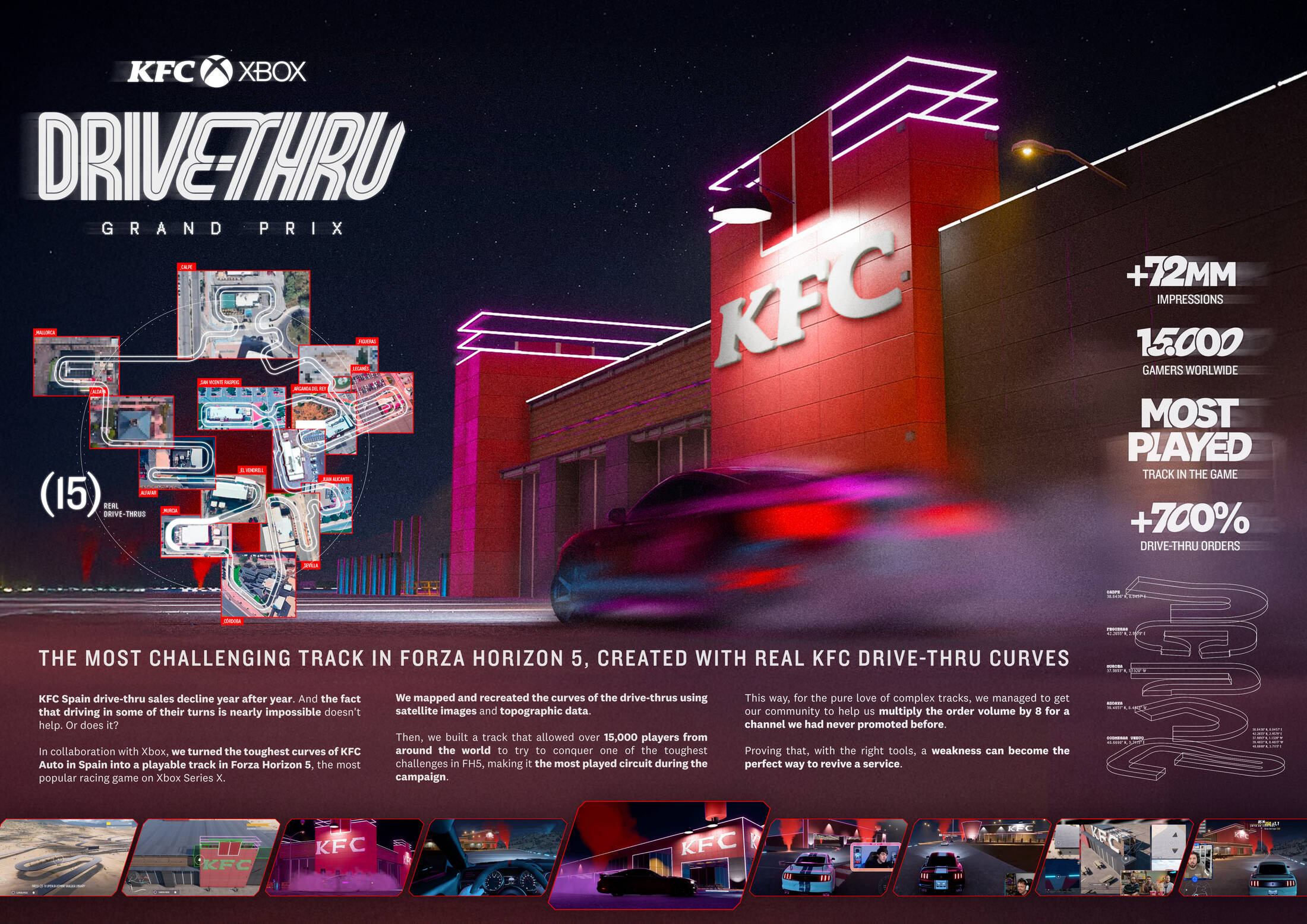 ერთი შეხედვით არანაირი კავშირი აქვს სწრაფ კვებასა და სწრაფ მანქანებს, თუმცა, როგორც ჩანს, ასე არც KFC ფიქრობს და არც Xbox. ეს იდეა მომხმარებლებისთვისაც რომ დაემტკიცებინათ, ესპანეთში Drive-Thru-სთვის განკუთვნილი ხაზები მაღალსიჩქარიან ვირტუალურ ტრასებად აქციეს და პოპულარული სარბოლო თამაში Forza Horizon 5-ის ფარგლებში სახალისო კამპანია წამოიწყეს.