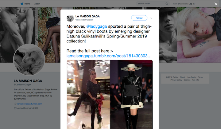 აღსანიშნავია, რომ ფეხსაცმელი 2019 წლის გაზაფხული-ზაფხულის კოლექციიდან არის და ამის შესახებ თავად “La Maison De Gaga-მ”, რომელიც მომღერლის იმიჯზე ზრუნავს, Twitter-ზე გამოაქვეყნა ინფორმაცია.