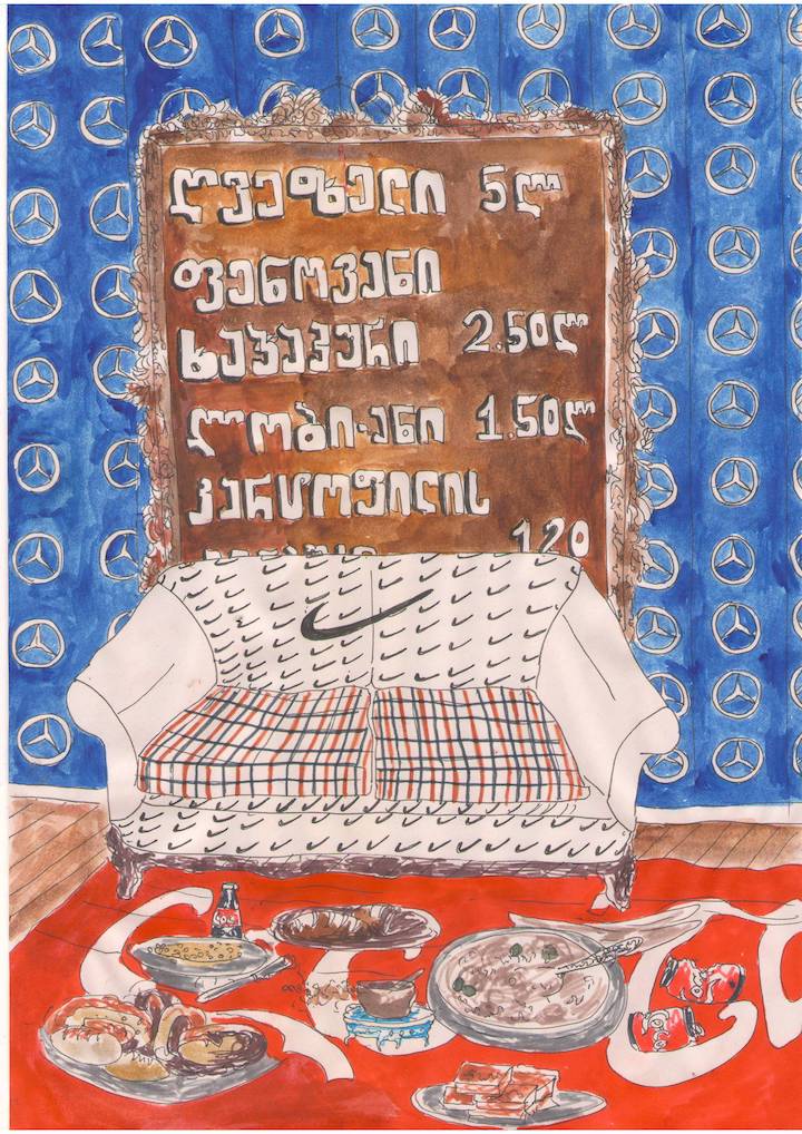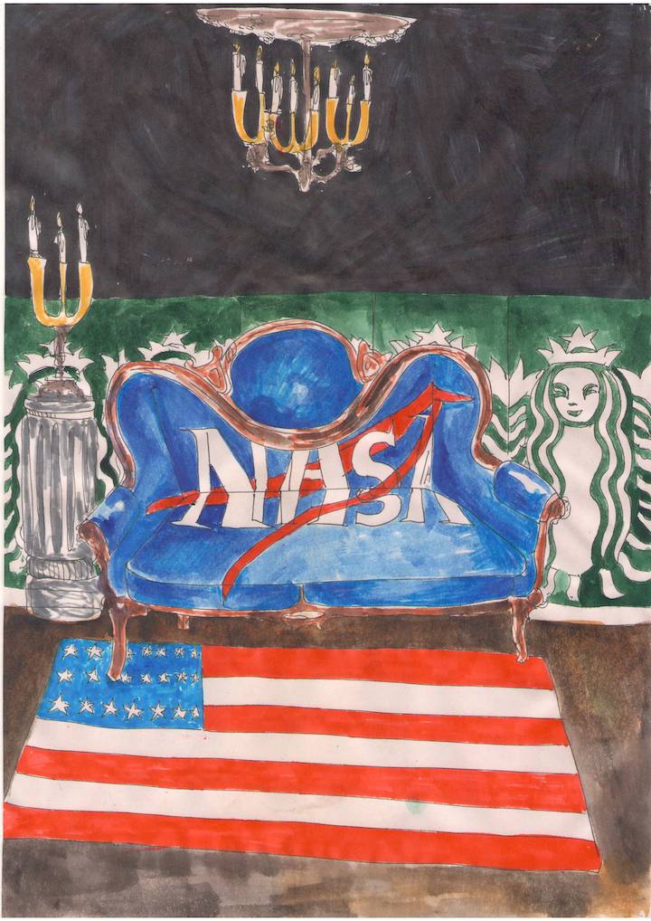 ბრენდების სერიას რაც შეეხება, შემთხვევით დავიწყე, არ მიფიქრია, რატომ ვარჩევ კონკრეტულად ამა თუ იმ ბრენდს, ალბათ უფრო კლასიკაა, მარტივად იჭერს სხვისი თვალი და მეტ ყურადღებას აქცევენ მათ. ზოგი უბრალოდ ვიზუალურად მომწონს, როგორიცაა: Mcdonalds, Coca-cola, Nike, Nasa და ამერიკის დროშა. ამ სერიის მთავარი იდეა ალბათ იუმორია ისევ – რომ შეგიძლია, მაგიდას ნაიკის გადასაფარებელი გადააფარო და მაკდონალდსის ჭაღი გქონდეს.ზოგიერთ ნახატში ძირს, ხალიჩის მაგივრად ნაიკის მაისურია გაფენილი, ეს დეტალი მგონია, რომ ბევრს გვინახავს სახლში – როდესაც იატაკის ტილოს ძველი მაისურით ჩავანაცვლებთ რომელიც აღარ გვჭირდება. მოკლედ, ესაა წარმოსახვის თავისუფლება – უბრალოდ სეროზულად არ აღიქვა მსოფლიოს უდიდესი ბრენდებიც კი.