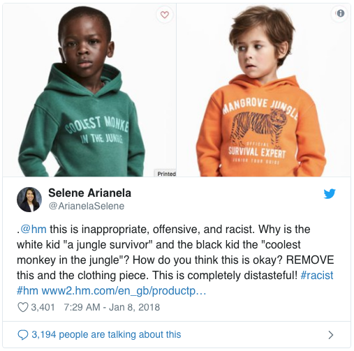 ტანსაცმლის ბრენდმა ეს რეკლამა იანვარში გამოუშვა. ესაა პატარა აფროამერიკელი ბიჭუნა, რომელსაც მწვანე ჰუდი აცვია, წარწერით “Coolest Monkey in the Jungle” – “ყველაზე მაგარი მაიმუნი მთელს ჯუნგლებში”. საზოგადოება რეკლამამ განარისხა, მათი თქმით, ბრენდს კულტურული მგრძნობელობა არ აქვს…