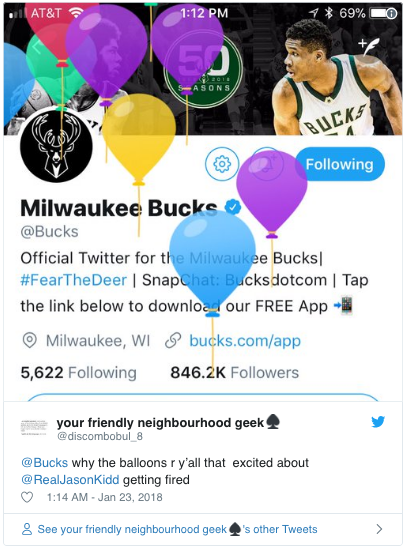 სამწუხაროდ, ბრენდის ბუშტები ეკრანზე მაშინ გამოჩნდა, როდესაც კალათბურთის გუნდის მთავარი მწვრთნელი ჯეისონ კიდი დაითხოვეს იანვარში. ფანებმა ჩათვალეს, რომ კომპანია ამ მოვლენას ზეიმობდა. სინამდვილეში, Milwaukee Bucks საკუთარი ფრანჩაიზინგის 50 წლის იუბილეს აღნიშნავდა.