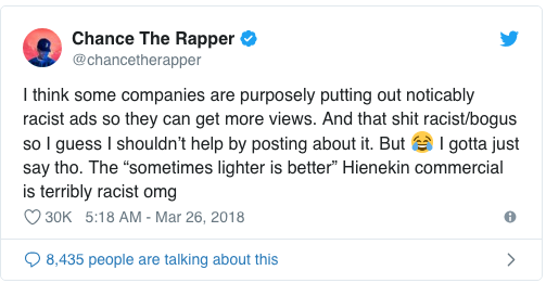ლუდის მწარმოებელმა კომპანიამ Heineken, მარტის თვეში, რეკლამა გამოუშვა. 30-წამიან ვიდეორგოლში ჩანს, როგორ უგზავნის ბარმენი ლუდს, სამი აფროამერიკელის გავლით, თეთრკანიან ქალს. ვიდეორგოლის მთავარი გზავნილია “Sometimes, lighter is better”, რაც ითარგმნება როგორც “ზოგჯერ, უფრო მსუბუქი სჯობს, თუმცა, სიტყვა Light – ღია ფერსაც ნიშნავს, რამაც რასისტული ელფერი შესძინა რეკლამას და ათასობით ადამიანი ნეგატიურად განაწყო.
