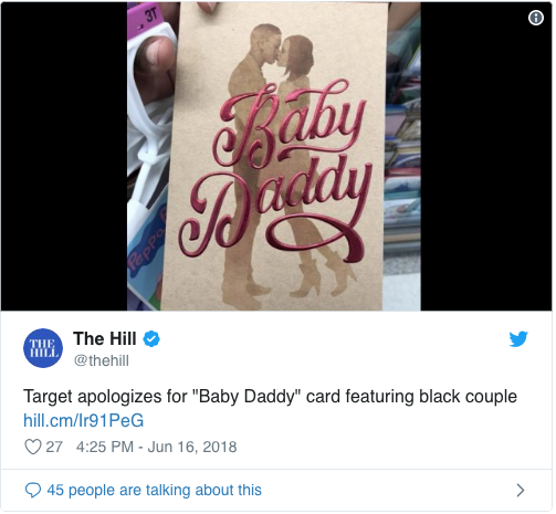 ივნისში, მამის დღესთან დაკავშირებით გამოცემულმა მისალოცმა ბარათმა მომხმარებლები აღაშფოთა. ბარათზე აფრო-ამერიკელი წყვილია ასახული, ფრაზით “Baby Daddy”. Baby Daddy-ს უწოდებენ მამას, რომელიც შვილის დედისთვის არც პარტნიორს წარმოადგენს და არც ქმარს. როგორც ფეისბუკ მომხმარებლებმა აღნიშნა, ეს იყო მსგავსი შინაარსის მქონე ერთადერთი ბარათი. Target-მა ბოდიში მოიხადა და ბარათი 900 მაღაზიიდან უკან გაიწვია.
