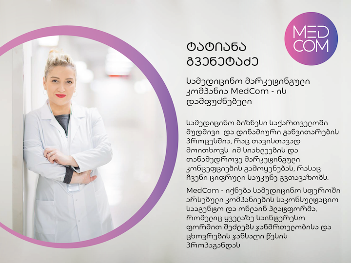 ტატიანა გვენეტაძის თქმით, სამედიცინო სფეროში სწორი მარკეტინგული კომუნიკაცია ძალიან მნიშვნელოვანია. MedCom კი ზუსტად ამ მიმართულებით ეხმარება კომპანიებს.