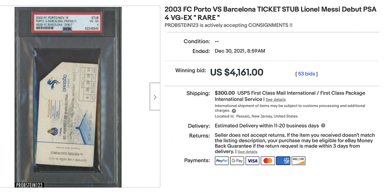 პორტუსთან გამართულ ისტორიულ შეხვედრას ბევრი გულშემატკივარი არ დასწრებია, თუმცა ერთ-ერთმა მათგანმა, რომელმაც მატჩზე დასასწრები ბილეთი შეინახა, ჯერ საკუთარი კოლექცია გაამდიდრა, 2 დღის წინ კი Ebay-ს აუქციონზე გასაყიდად გამოიტანა. დაძაბული და გარდამავალი აუქციონი საბოლოოდ $4,161.00-იან ნიშნულზე შეჩერდა, სწორედ ამ თანხის სანაცვლოდ ბილეთს ახალი მფლობელი ყავს.