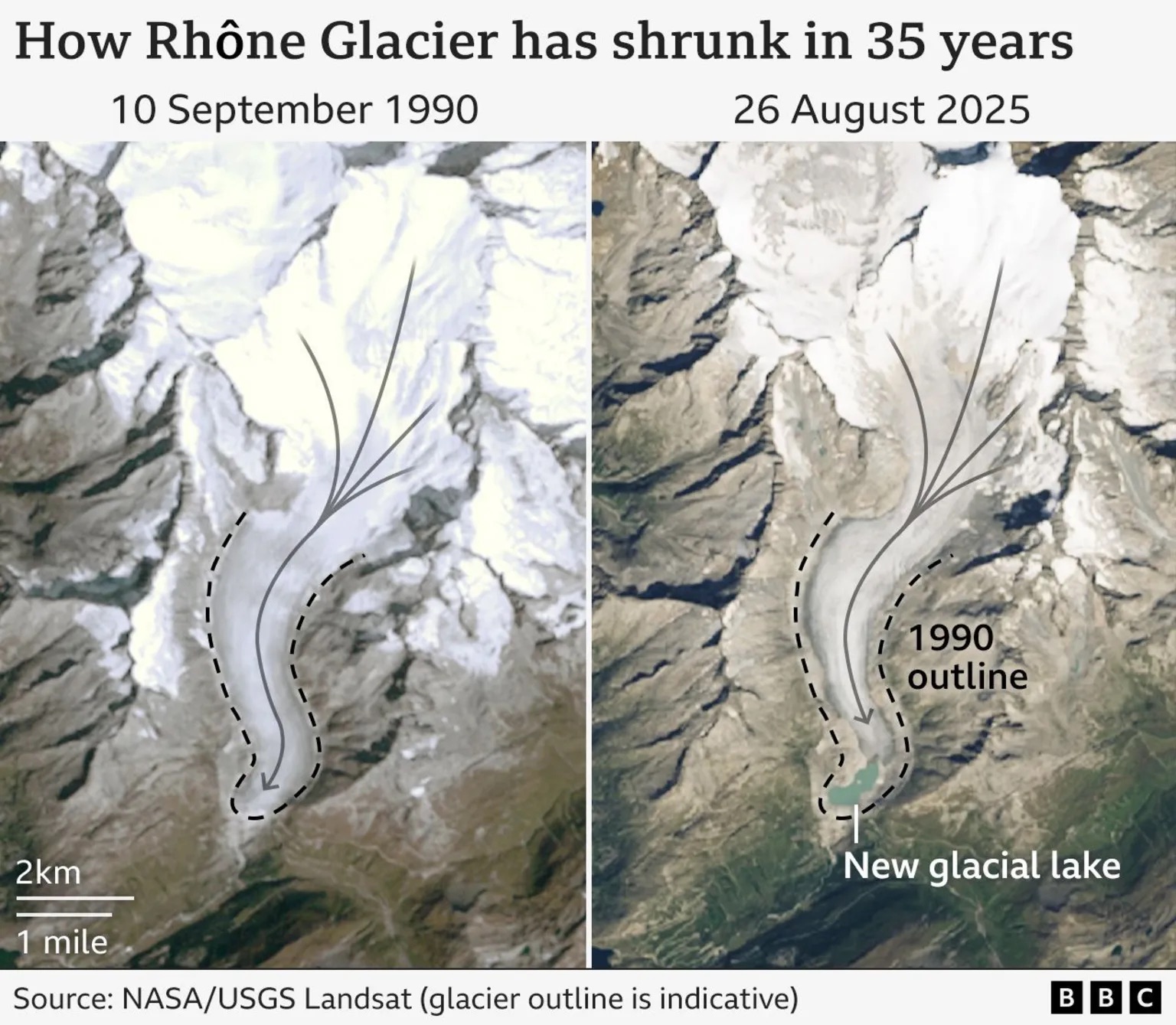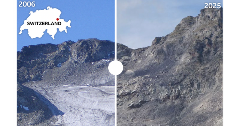 შვეიცარიის მყინვარებზე კი ამან განსაკუთრებით იმოქმედა. GLAMOS-ის მიხედვით, ბოლო 10 წელში ყინულის მეოთხედი დადნა. ამ ამბავს კი ახლა ფოტოები გვიყვება — სატელიტური კადრები აჩვენებს, როგორ შეიცვალა რონის მყინვარი 1990 წლის შემდეგ, ანუ მას შემდეგ, რაც მას ჰასი ოჯახთან ერთად ესტუმრა. მყინვარის წინ ადრე თუ ყინული იყო, დღეს ტბას ვხედავთ.