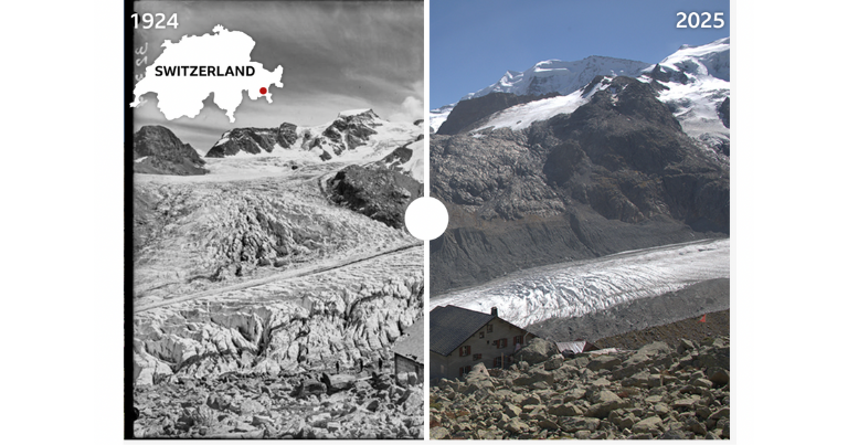 და ალპების ყველაზე დიდმა მყინვარმა Great Aletsch ბოლო 75 წლის განმავლობაში დაახლოებით 2.3 კმ-ით უკან დაიხია — იქ, სადაც ყინული იყო, დღეს ხეებს ვხედავთ.
