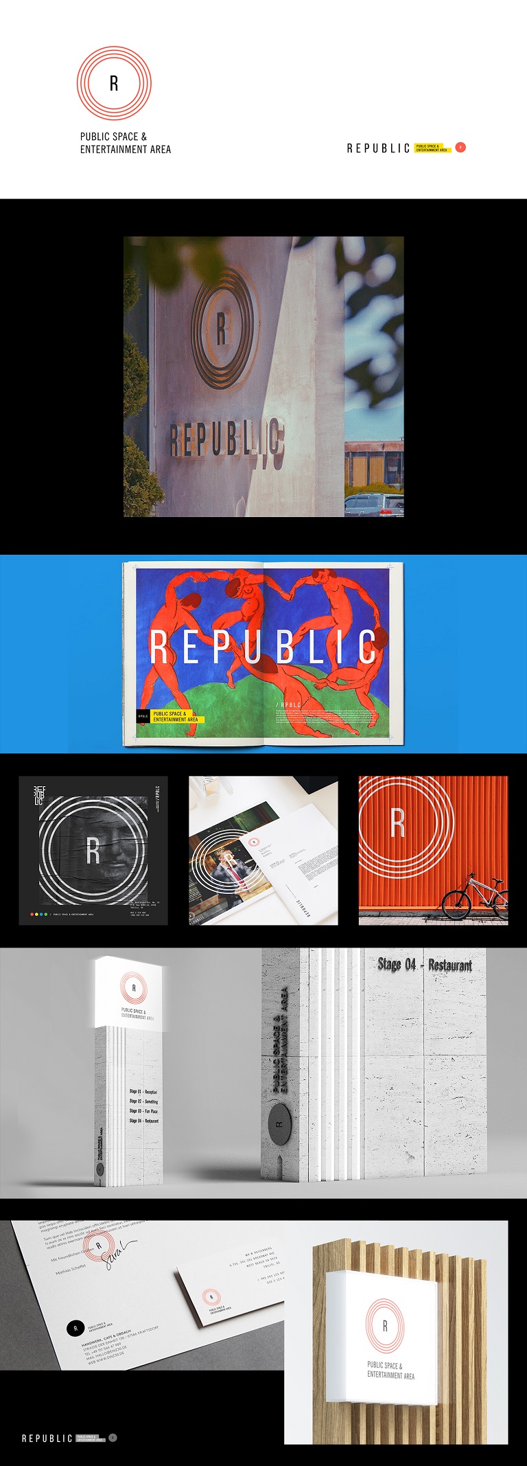 „რესპუბლიკა“ პირველი რესპუბლიკის მოედანზე მდებარეობს (ყოფილი „ვარდების რევოლუციის“ მოედანი). ესაა ოთხსართულიანი შენობა, რომელიც თავს უყრის საღონისძიებო სივრცესა და მაღალი კლასის რესტორანს, ღია ვერანდითა და შთამბეჭდავი ხედით. ბრენდის კონცეპტი სწორედ მისი ფიზიკური და ვერბალური გამოვლენიდან ჩამოყალიბდა. ოთხი დამოუკიდებელი, თუმცა ერთ ტერიტორიაზე მოქცეული სივრცე ლოგოტიპში ასახულ ოთხ წრეს ეხმიანება. წრე კი, მეტაფორულად, რესპუბლიკის განმარტებას გადმოსცემს.