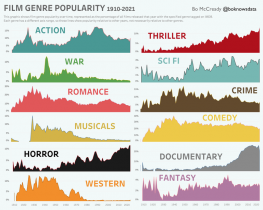 დროთა განმავლობაში ჩვენი კინოგემოვნება იცვლება და საინტერესოა, როგორ. ბო მაკკრიდი წარმოგვიდგენს ჩარტებს, რომლებშიც დეტალური ვიზუალიზაციაა, თუ რა ჟანრები დომინირებდა ჰოლივუდში გასული და მიმდინარე საუკუნის სხვადასხვა ეტაპზე.