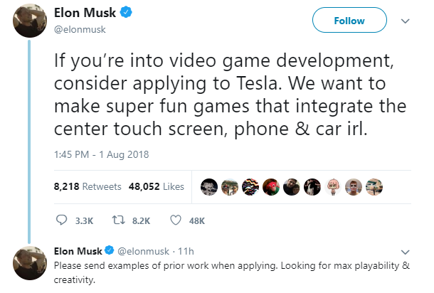 „ჩვენ გვინდა, შევქმნათ მხიარული და გასართობი ვიდეო თამაშები, რომლებიც ერთად იქნება ინტეგრირებული ავტომობილის ცენტრალურ სენსორულ ეკრანსა და ტელეფონში“, – წერს ილონ მასკი „ტვიტერის“ საკუთარ გვერდზე.
