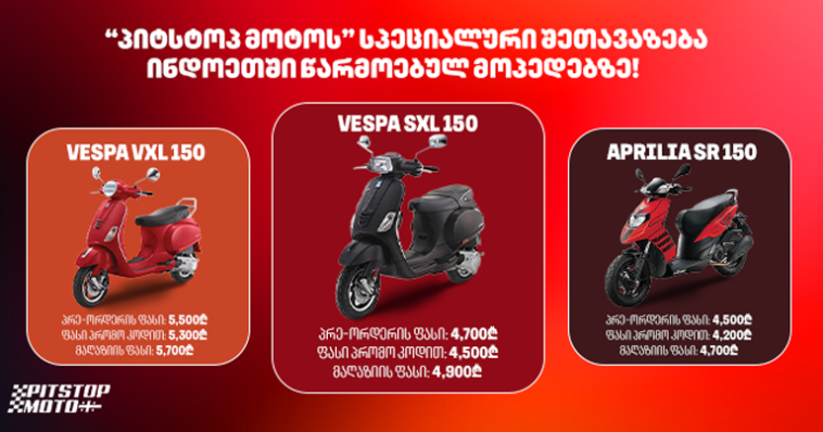 მოტო მაღაზია „პიტსტოპ მოტო” მოტომოყვარულებს შესაძლებლობას აძლევს სპეციალური ფასით ისარგებლონ ინდოეთში წარმოებულ “ვესპასა” და “აპრილიას” მოდელებზე.