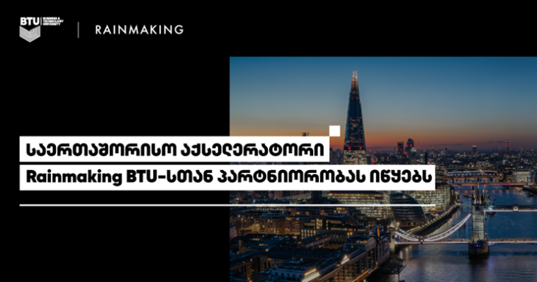 ბიზნესისა და ტექნოლოგიების უნივერსიტეტმა (BTU) და წამყვანმა გლობალურმა ინოვაციურმა ორგანიზაციამ Rainmaking Innovation Europe-მა დაიწყეს პარტნიორობა, რომელიც მიზნად ისახავს საქართველოს სტარტაპ ეკოსისტემის განვითარებასა და ახალგაზრდების – სტუდენტების, მეწარმეებისა და ინოვაციური იდეების ავტორების – მხარდაჭერას.