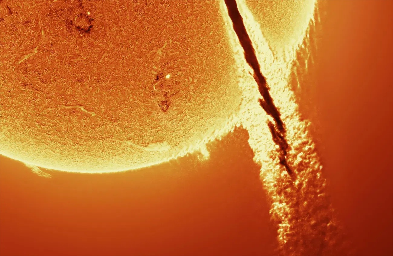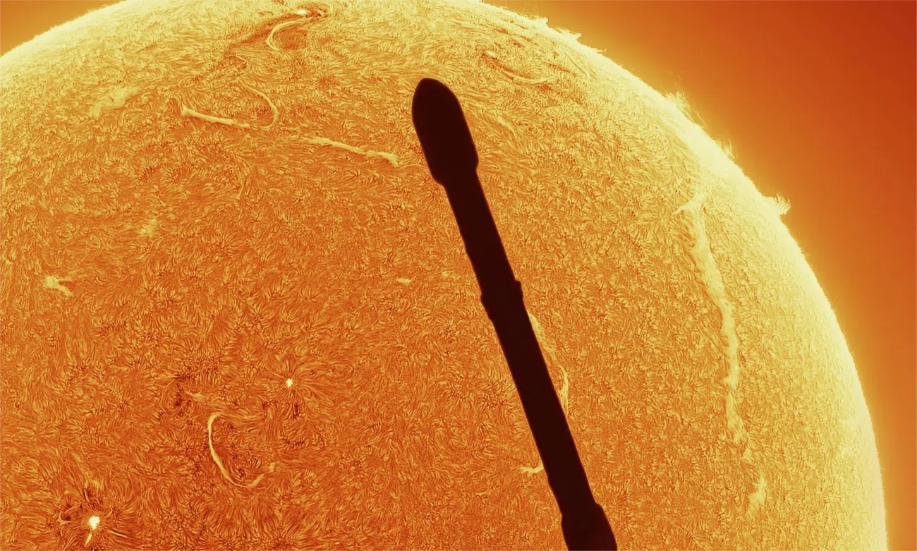 ასტროფოტოგრაფი ენდრიუ მაკკართის მიერ გადაღებული ფოტო Space X-ის რაკეტის ორბიტაზე გაშვებისას აჩვენებს, თუ როგორ ამოძრავებს ხომალდის სიმძლავრე მზის ქრომოსფეროს — ეს კი ამგვარი ტიპის პირველი სურათია, რომელიც, თავის მხრივ, მაკკართის თავდადებასა და განსაკუთრებულ მზაობაზე მიგვითითებს.