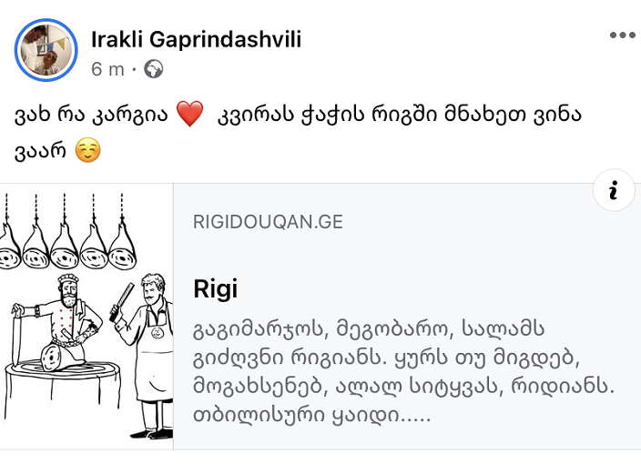 სულ ცოტა ხნის წინ, თბილისს თანამედროვე დუქანი “რიგი” დაემატა. ამ ადგილმა, დედაქალაქის საუკუნოვანი ისტორია ოსტატურად დაიტია და ძველი ქალაქის რიგების იდეა, კულტურა, გასტრონომია და რაც მთავარია, ურთიერთობა თანამედროვეობაში გადმოიტანა. ამ დინამიკურმა ბრენდმა ფიროსმანის “მზარეული” ცოცხალ პერსონაჟად აქცია, რომელმაც საკუთარ თავზე სტუმრების რიგიანი გამასპინძლება აიღო. მზარეულმა ახალი მეგობრების შეძენა განიზრახა და “რიგის” გასტრონომიულ ლხინში დასაპატიჟებლად, უჩვეულო მოსაწვევები დაუგზავნა.