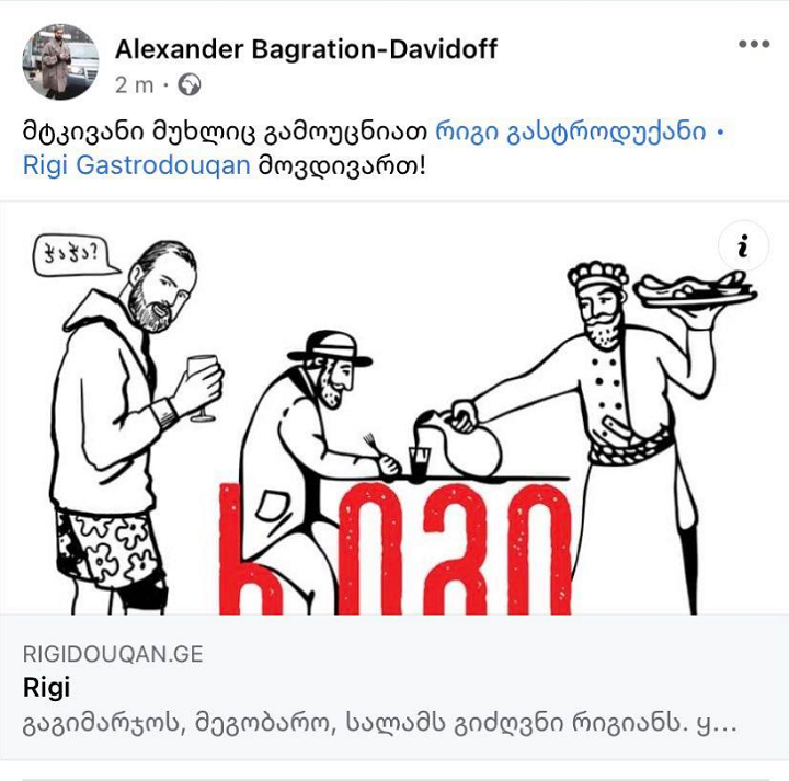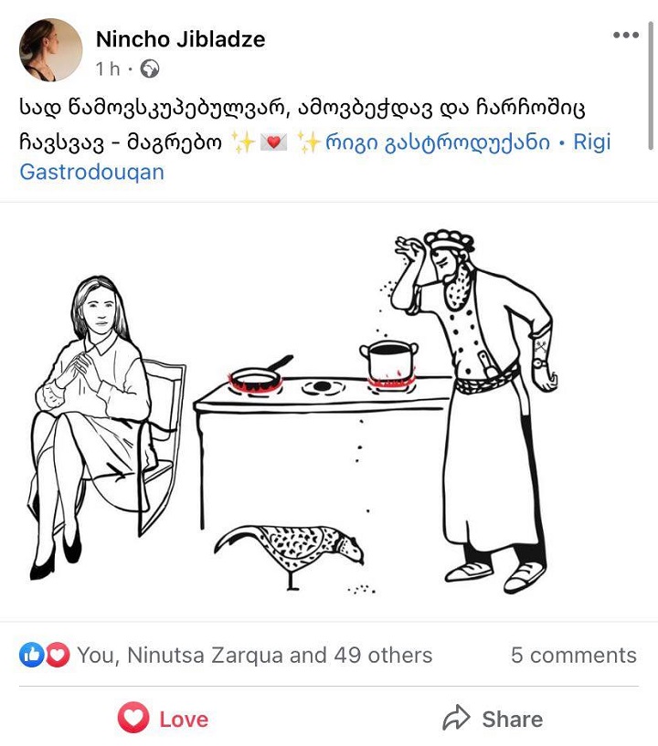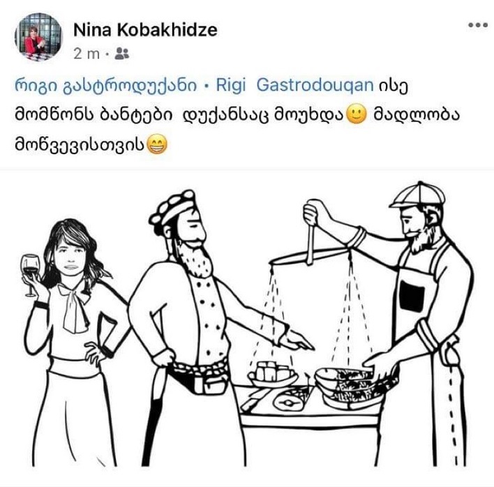 ბოლო დღეებია, ილუსტრაციებით აღფრთოვანებული ადრესატების პოსტებს წააწყდებით სოციალურ ქსელში. როგორც ჩანს, ჩანაფიქრმა გაამართლა – მეგობრულმა მასპინძელმა “რიგის” სტუმრებს 3 და 4 ოქტომბერს, ქალაქური მოლხენის ტრადიციის გასაზიარებლად უხმო, რათა მათთან ერთად გაიზიაროს თბილისური ეზოების ყოველდღიურობა და ძველი თბილისის ბაზრის ესთეტიკა. თანაც, პირობა დადო, რომ გასტროლხინის სტუმრებისთვის გაშლილ სუფრას ჩიტის რძე არ დააკლდება, ძველი თბილისური ბაზრით შთაგონებულ პურის, ღვინის, ყველის, საყასბო თუ საბაყლო რიგებში, ფუსფუსსა და მოლხენას ბოლო არ ექნება. სტუმრების თვალის გასახარად, პურიც იქვე გამოცხვება და მეგრულ სულგუნსაც დუქანშივე ამოიყვანს გამოცდილი ოსტატის ხელი. ადგილზე მომზადებულ თუ საქართველოს სხვადასხვა რეგიონიდან შეკრებილ პროდუქტებს კი, იქვე დააგემოვნებს, მერე, შინაც წაიღებს ყველა მსურველი და მეგობრობის ხიდიც გაიბმება.