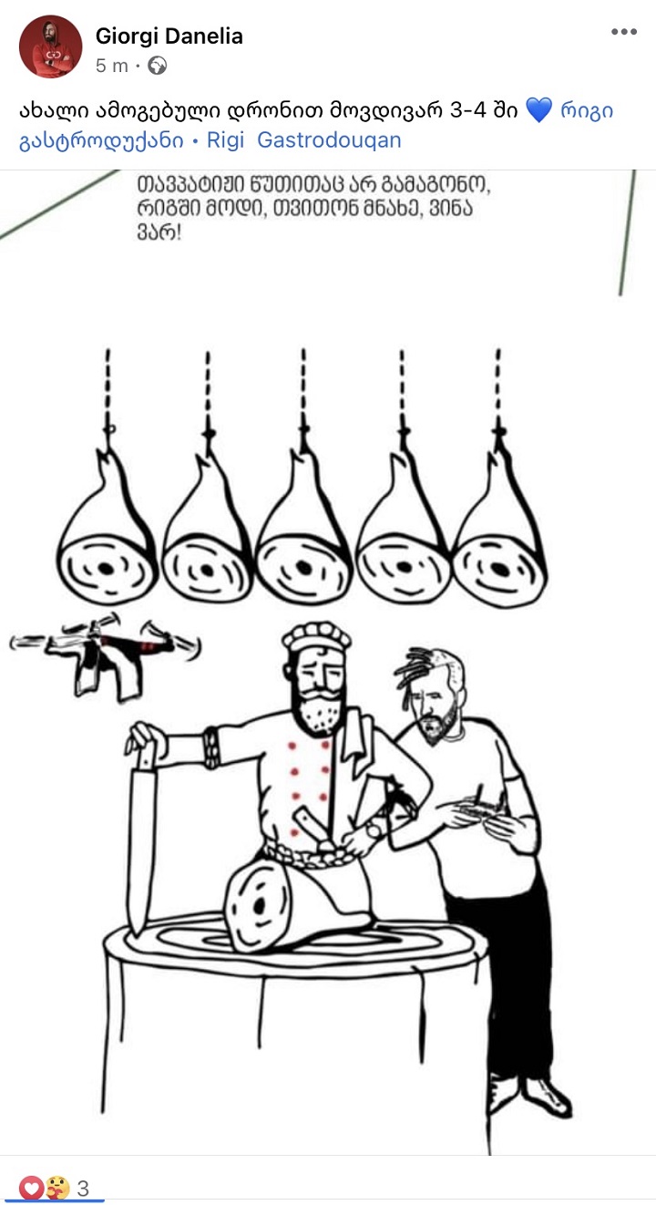 George Gamez: “შემოდგომის დადგომისთანავე, George Gamez Creative Studio-ს მოგვეცა კიდევ ერთი ძალზედ საინტერესო გამოწვევა: “რიგი”-ს უმშვენიერესი “შეფი” პერსონაჟის ილუსტრაციების სტილში, უნდა შეგვექმნა კონკრეტულ ადამიანთა ილუსტრაციები, რომლებიც, შემდგომ ინტეგრირებულნი იქნებოდნენ, თავიანთი სახასიათო როლით, “რიგის” უკვე არსებულ კონცეფციაში. გადავარჩიეთ, ქვეყნის ასიოდე სახასიათო – გასტრონომ-კულინარიასთან დაახლოებული, სამაგალითო, წარმატებული, გამოცდილი თუ დამწყები, ზოგჯერ უსიტყვო, მაგრამ მეტწილად გამგებიანი, შეფ/მზარეულ/კრიტიკოს/ექსპერტ/ბიზნესმენ/საზოგადო მოღვაწ/ამბასადორ/კრეატორი პერსონაჟის კანდიდატურა, შევქმენით ფოლდერი, სახელად “Rigi & George Gamez Collaboration” და შევუდექით ნატიფი ხაზით მათ გამოხატვას.”