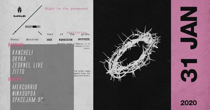 31 იანვარს, BASSIANI ქართული საკლუბო სივრცის წარმომადგენლებს უმასპინძლებს – SKYRA, ZESKNEL, ZITTO და KANCHELI-ს HOROOM-ის ოთახში MERCURRIO, NINASUPSA და SPACEJAM 92 შეუერთდებიან. ბილეთებისთვის ეწვიეთ ბმულს.