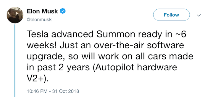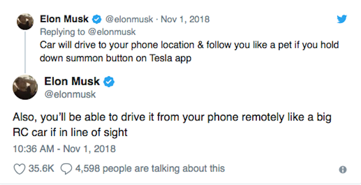მისი სიტყვებით, ფუნქცია Advanced Summon, რომელიც თავსებადი იქნება ყველა Tesla-ს ავტომობილთან, რომელიც ბოლო ორი წლის განმავლობაში გამოვიდა, შესაძლებელს ხდის ავტომობილის დისტანციურ მართვას სმარტფონის მეშვეობით, თუ ის მხედველობის არეშია. ეს ახალი ფუნქცია, „ტესლას“ ახალ ავტომობილებში უახლოესი 6 კვირის განმავლობაში გაჩნდება.