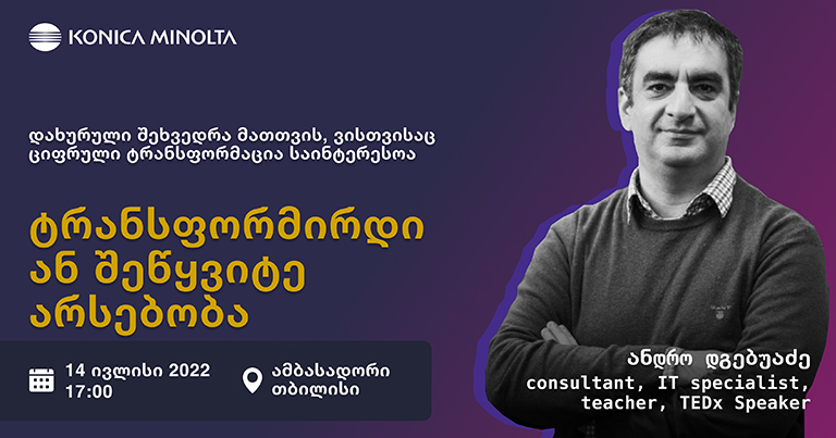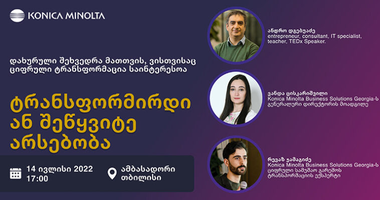 პანდემიამ კომპანიებისთვის ბევრი ისეთი პროცესი დააჩქარა, რომელიც რამდენიმე წლის ვადაში ეტაპობრივად უნდა დამკვიდრებულიყო. ახლა კი ბიზნეს-ლიდერები ვალდებულნი არიან, ამ სწრაფად ცვალებად სამყაროში, სადაც წამყვან როლს ციფრული ტექნოლოგიები იკავებს, მასშტაბური ტრანსფორმაცია გაიარონ. სწორედ ამას ეხება Konica Minolta Business Solutions Georgia-ს დახურული ღონისძიებაც, სადაც საშუალო და მსხვილი ბიზნესის ტოპ მენეჯერებს უმასპინძლებენ.