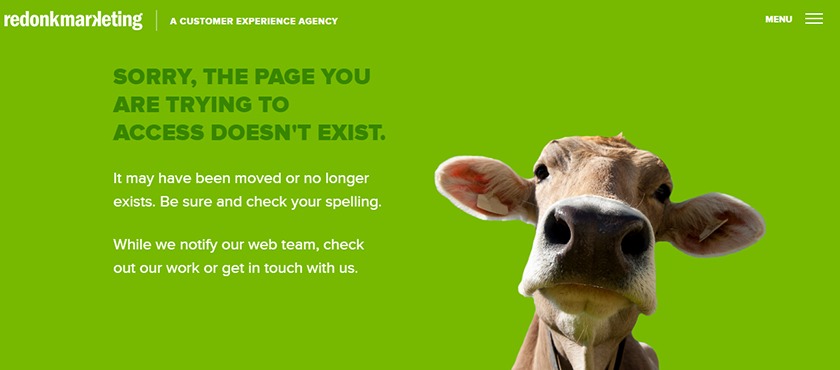 შეუძლებელია ასეთმა ვიზუალმა ღიმილი არ მოგგვაროთ. Redonk-მა გადაწყვიტა, რომ მომხმარებლებისთვის პრობლემური გამოცდილება უფრო პოზიტიური გაეხადა. მათი 404 გვერდი სტუმრებს მოუწოდებს დაუკავშირდნენ კომპანიას და გაეცნონ მათ ნამუშევრებს, იმავდროულად კი გუნდი შეტყობინებას იღებს 404 შეცდომის შესახებ.