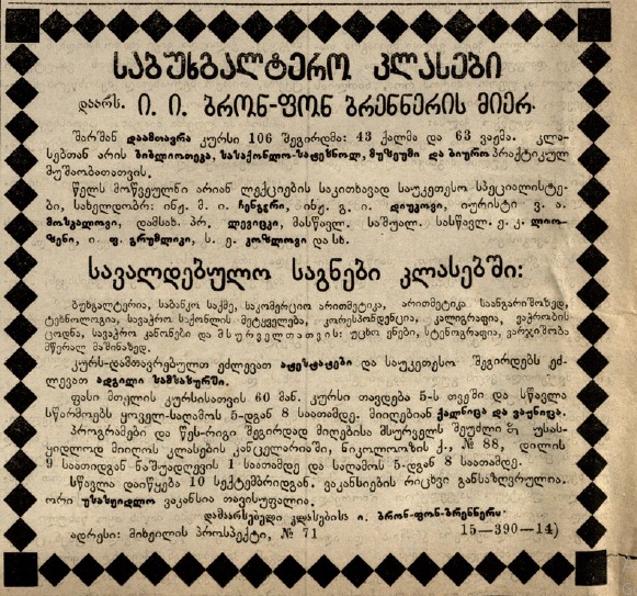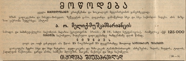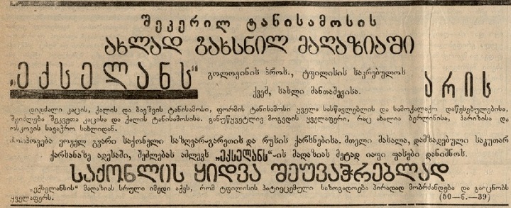 „ . . . ახლად გახსნილ მაღაზიაში „ექსელანს“ არის დიდძალი კაცის, ქალის და ბავშვის ტანისამოსი, ფორმის ტანისამოსი ყველა სასწავლებლის და სამოქალაქო დაწესებულებისა. შეიძლება შეკვეთა კაცისა და ქალის ტანისამოსისა. განუწყვეტლივ მოგვდის ყველაფერი, რაც ახალი ბერლინისა, პარიზისა და მოსკოვის სავაჭრო სახლიდან . . . მთელი მასალა, დამზადებული საკუთარ ქარხანაზე ადესაში, შეძლებას აძლევს „ექსელანს“-ის მაღაზიას მეტად იაფი ფასები დანიშნოს . . . “ – გაზეთი „ცნობის ფურცელი“, 1905 წელი (# 2961).