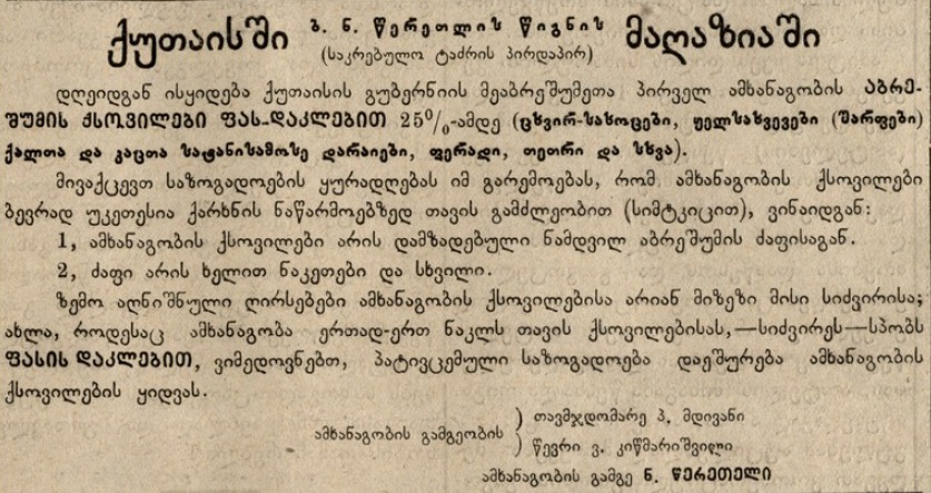 რეკლამების მიხედვით ვიგებთ, რომ საქართველოში არა მხოლოდ ადგილობრივად წარმოებული, არამედ უცხოური პროდუქციაც იყიდებოდა.