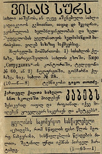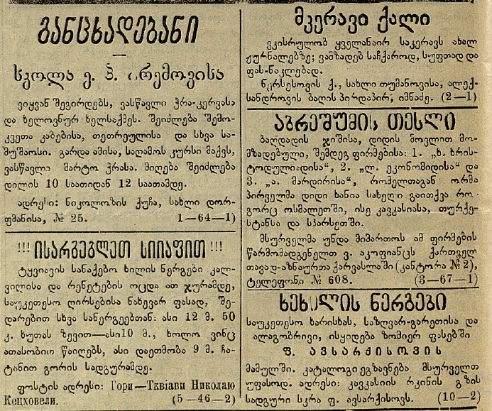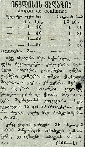 „მარკეტერის“ სპეციალურ მიმოხილვაში ნახავთ როგორი იყო მაშინდელი სარეკლამო ტექსტები, რაზე აკეთებდნენ აქცენტს და რა ხერხებით ცდილობდნენ მომხმარებლის ყურადღების მიქცევას. ასევე – რა სახელები ერქვა მაღაზიებს, თუ სხვა ტიპის სავაჭრო ან ბიზნეს დაწესებულებებს.